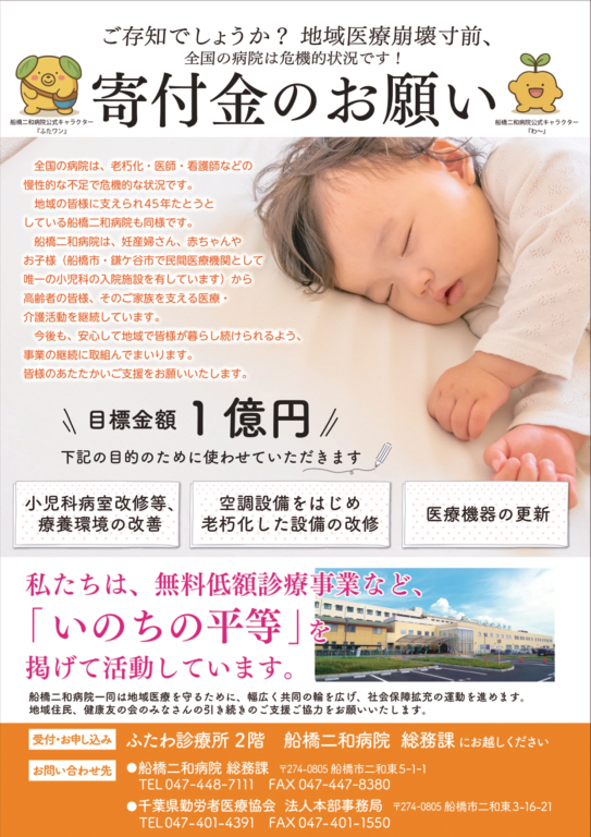 船橋二和病院は1981年(昭和56年)、この地域に安心してかかることができる病院が欲しいという地域住民のみなさんの声・ご寄付等をもとに開院した病院です。この間、患者さん、地域住民のいのちと健康を守る、24時間安心してかかることができる病院として、二次医療機関・救急医療、小児科病床の確保、産科分娩の維持など、地域医療を担ってきました。また当院では医療費の支払いにお困りの方への無料低額診療事業の実施など、「いのちの平等」を掲げて活動しています。