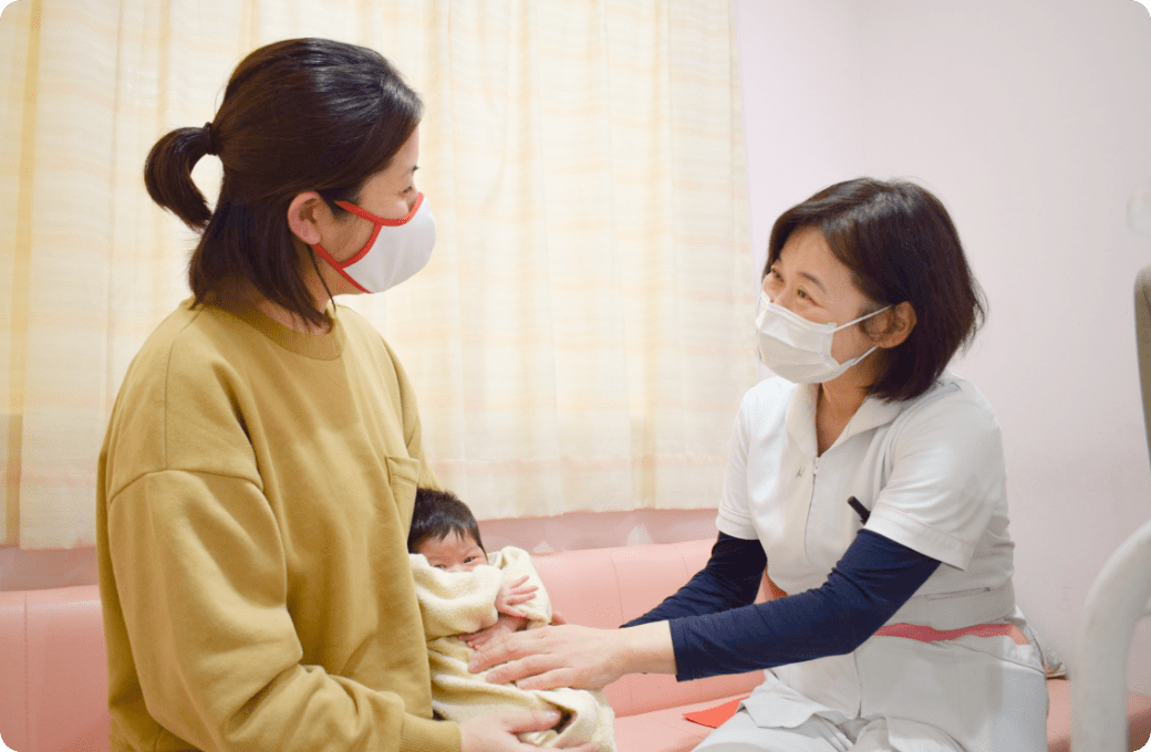 出産前後はより良いケアができるよう産科医師・助産師・看護師・薬剤師・公認心理士・小児科医・などと連携を取っています。また、生まれた後は小児科医の診察があります。